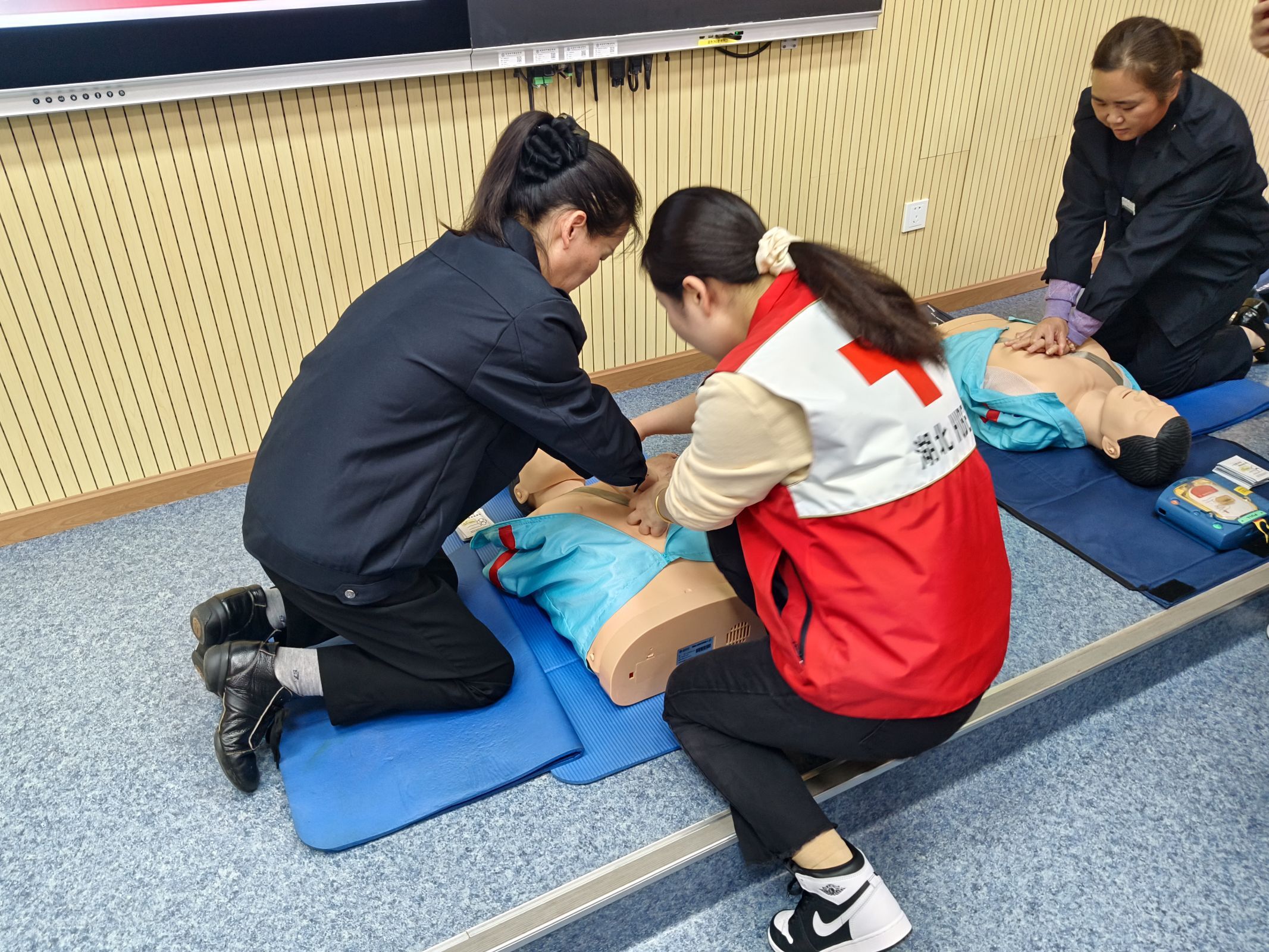 实操演练环节成为培训的“重头戏”。在专业医护团队的指导下,参训人员分组使用模拟人体教具和AED训练设备,逐一练习胸外按压、人工呼吸、电极片贴附等关键操作。“按压深度要达到5-6厘米,手肘必须打直发力”“AED开机后要严格按照语音提示操作”,讲师手把手纠正动作偏差,对按压频率、包扎力度等细节逐一指导,确保每位学员都能熟练掌握规范流程 。现场还创新设置模拟急救场景,让学员们分组协作完成“发现患者—评估状况—启动救援—实施急救”全流程演练,有效提升了应急响应的协同能力。此外,培训特别加入“心理急救”模块,指导学员在施救时通过安抚性话语稳定患者情绪,强化人文关怀意识 。